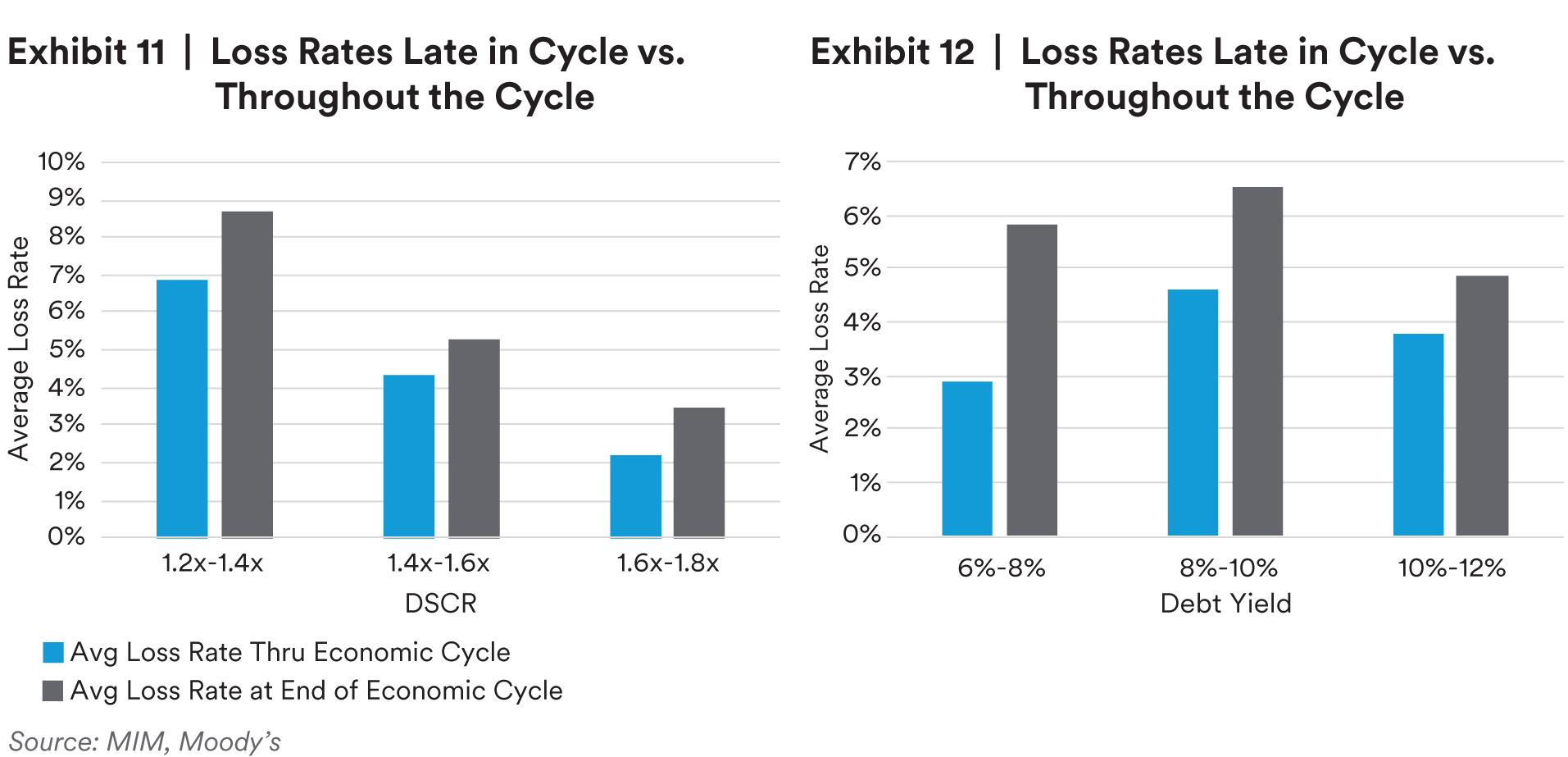 This holds true for both debt-service coverage ratios and debt yield as well. Exhibits 11 & 12 demonstrate that for both measures, incremental decreases in both DSCR and debt yield at initial underwriting can result in materially larger loss rates for transactions done near the end of an economic cycle, versus the entire cycle.