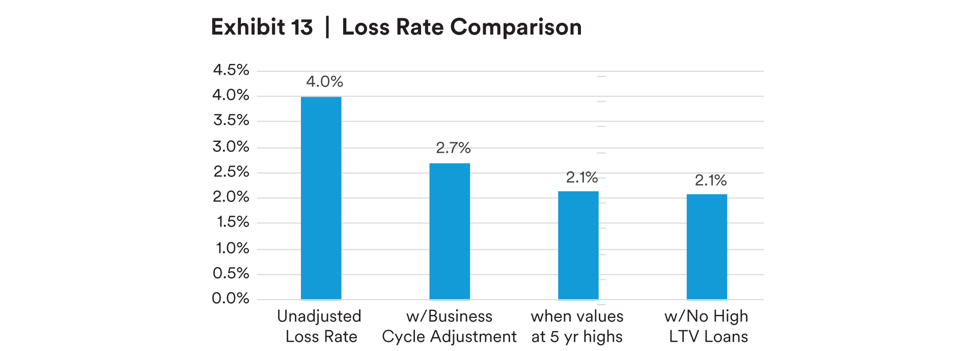 Not surprisingly, our tests showed that simply not underwriting any high LTV loans at all would have lowered loss rates (Exhibit 13). This can be understood as simply lowering tolerance for risk decreases expected losses. However, the back test also showed that underwriting lower LTV loans exclusively when a business cycle index showed weakening in the economy, or when property values were high relative to recent history, could produce a similar reduction in loss rate. Notably, not underwriting high-leverage loans when values are high produces almost identical loss rates as underwriting no high-leverage loans at all, with possibly less reduction of total loan volume. In other words, limiting higher-risk loans late in an economic cycle can reduce loss rates. And it is possible to gauge how late we are in the cycle, at least for underwriting purposes, from commonly available indices and pricing metrics.
