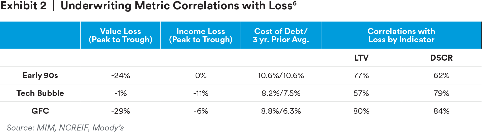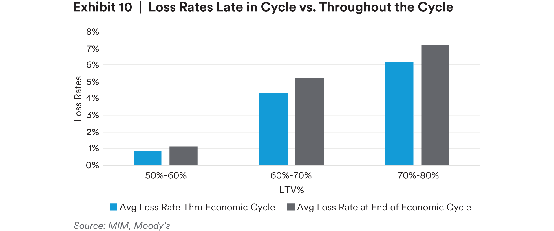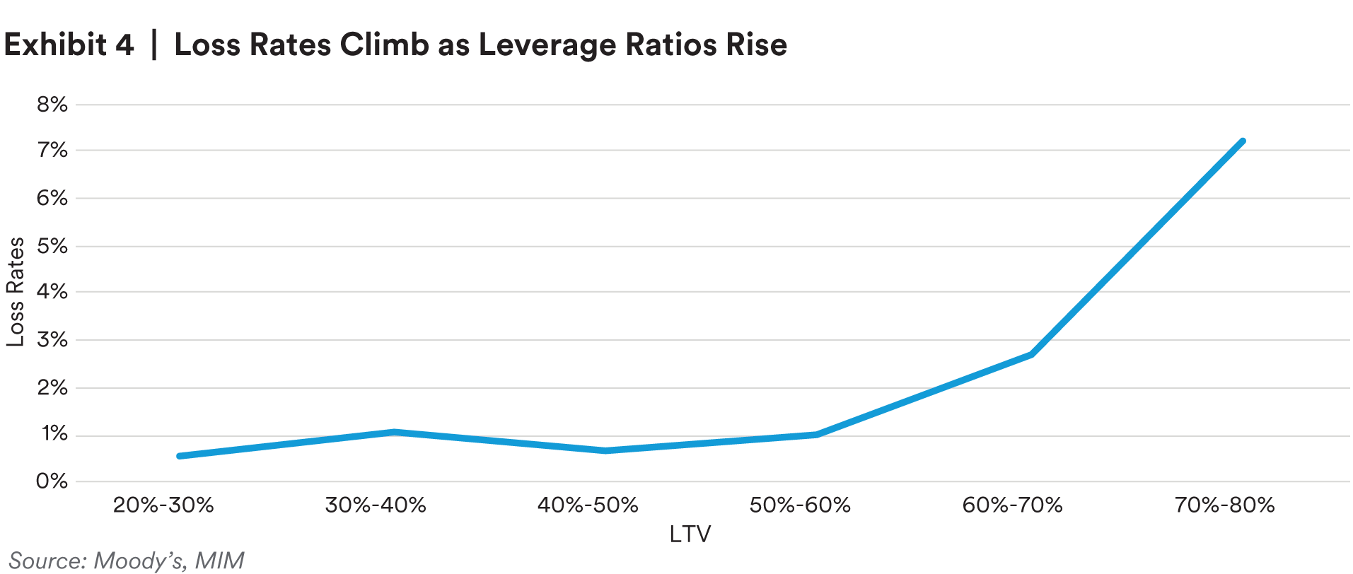 Exhibit 2 provides historical context, which helps to illustrate the difference between the two risk profiles. During the slowdowns of the early 1990s and 2007/2008, loss rates were more correlated with LTVs (relative to the early 2000s). Specifically, loans with a higher initial LTV (properties that had a larger amount of debt placed on them), had a higher probability of defaulting during these two downturns. This was because loans that were maturing during these periods were a challenge to refinance as the value of the underlying assets had materially declined.