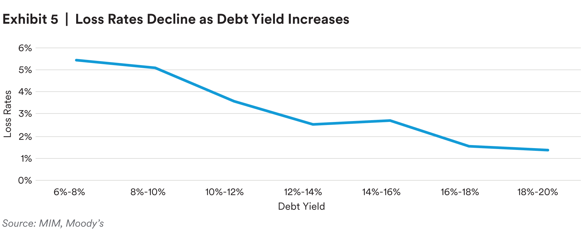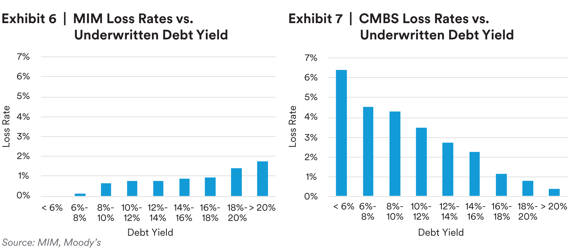 Debt yield can be a more meaningful measure than DSCR of property performance since debtservice coverage can appear deceptively strong in a low interest-rate environment. Debt yield typically offers a lender a more standardized view of risk as it indicates potential returns if the borrower can no longer stay in possession of the property. However, MIM’s experience with this metric has been the opposite of the larger CMBS history.