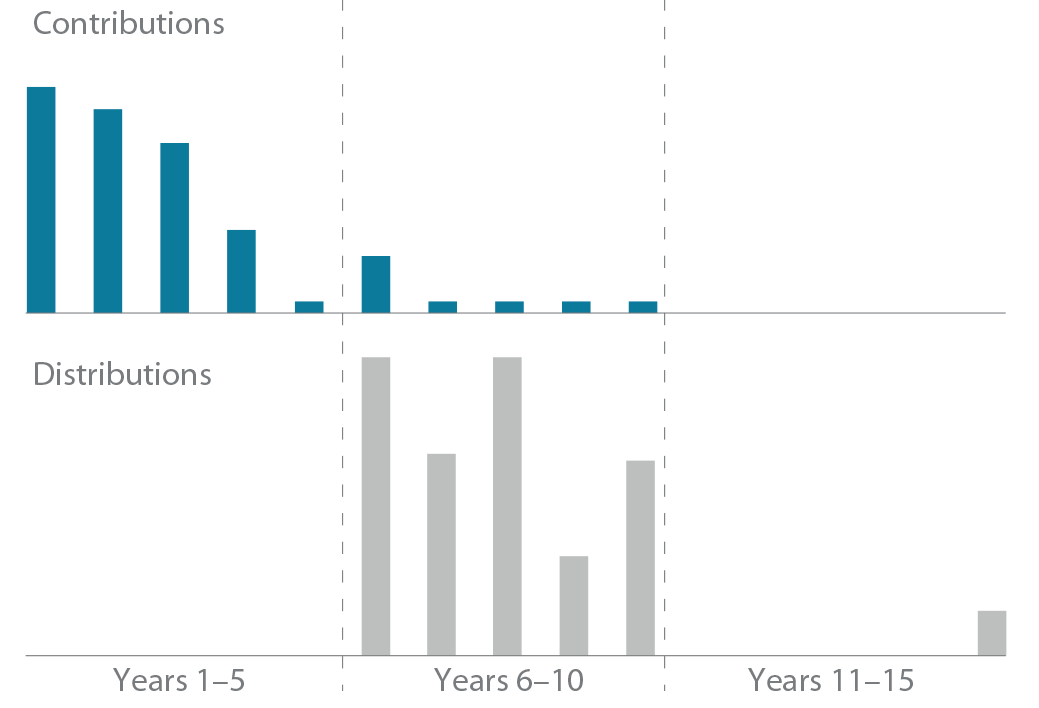 The tool we use to get a handle on the liquidity of private equity investments is duration. Why do we need something in addition to the hold period? The timing of the last distribution can be very different from when, on average, distributions were paid. Some funds have small residual net asset value (NAV) distributed in year 15, but 99% of the distributions were paid out by year 9. Similarly, there can be a large difference between when contributions were paid, on average, and the close of the fund. A buyout fund typically has an investment period of five or six years. In vintages where deals are hard to come by in early years, most of the contributions may occur late in the investment period.For a concrete example, see Figure 1. In this hypothetical fund, most contributions are paid between years 1 and 4; most distributions happen between years 6 and 10. The fund life is 15 years, which tells you very little about when the action happened! Most of the cash flows occurred before year 10. Duration allows us to idealize the cash flows of a fund as an investment with two cash flows: one contribution, and one distribution. Duration comes in two flavors, based on available data:» Cash flow duration, requiring all contributions and distributions;