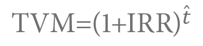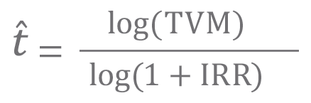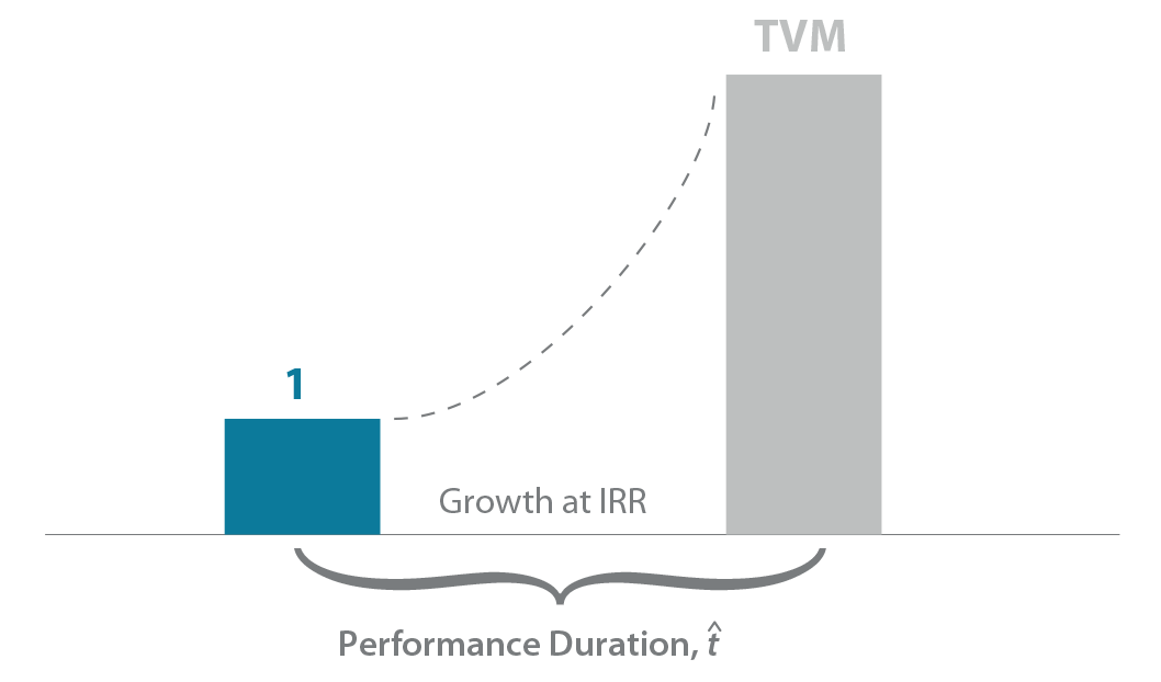 Performance duration is useful when the TVM and IRR are available but the underlying cash flows are not. This second flavor of duration answers the following question: How long would an initial investment of $1—compounded at the IRR—need in order to achieve the realized TVM?3 In other words, given the investment IRR and TVM, find t̂ such that