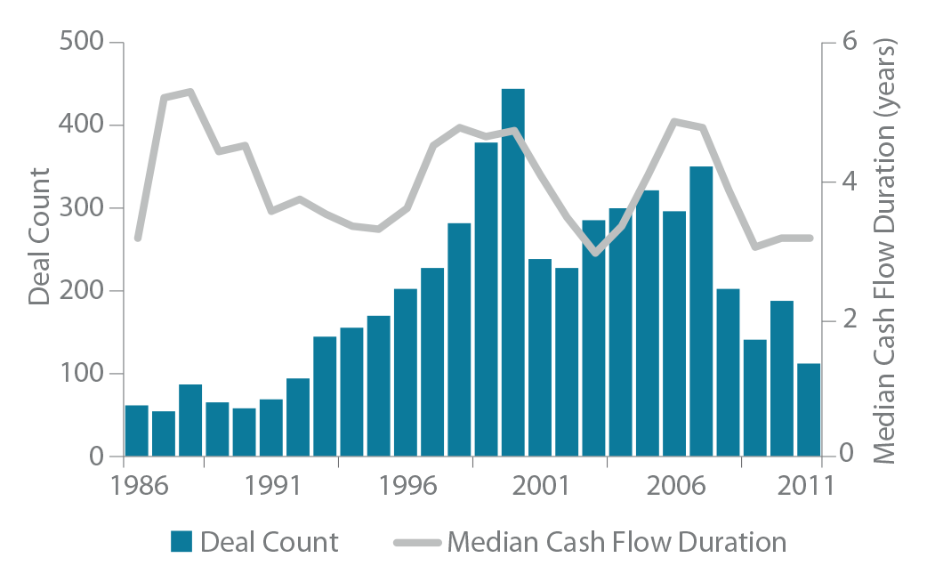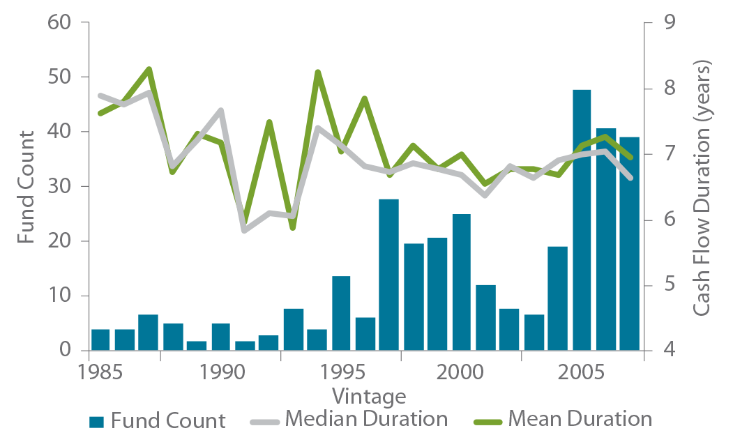 Capable of helping short- and long-term investors alike, private equity is not as deserving of its “illiquid” label as many believe. Although it is tempting to look at the fund hold as a summary of when all cash was returned, it is too coarse a measure. Looking into the duration of fund- and deal-level cash flows can provide a more nuanced view. The first meaningful effect is a cyclicality in fund and deal durations