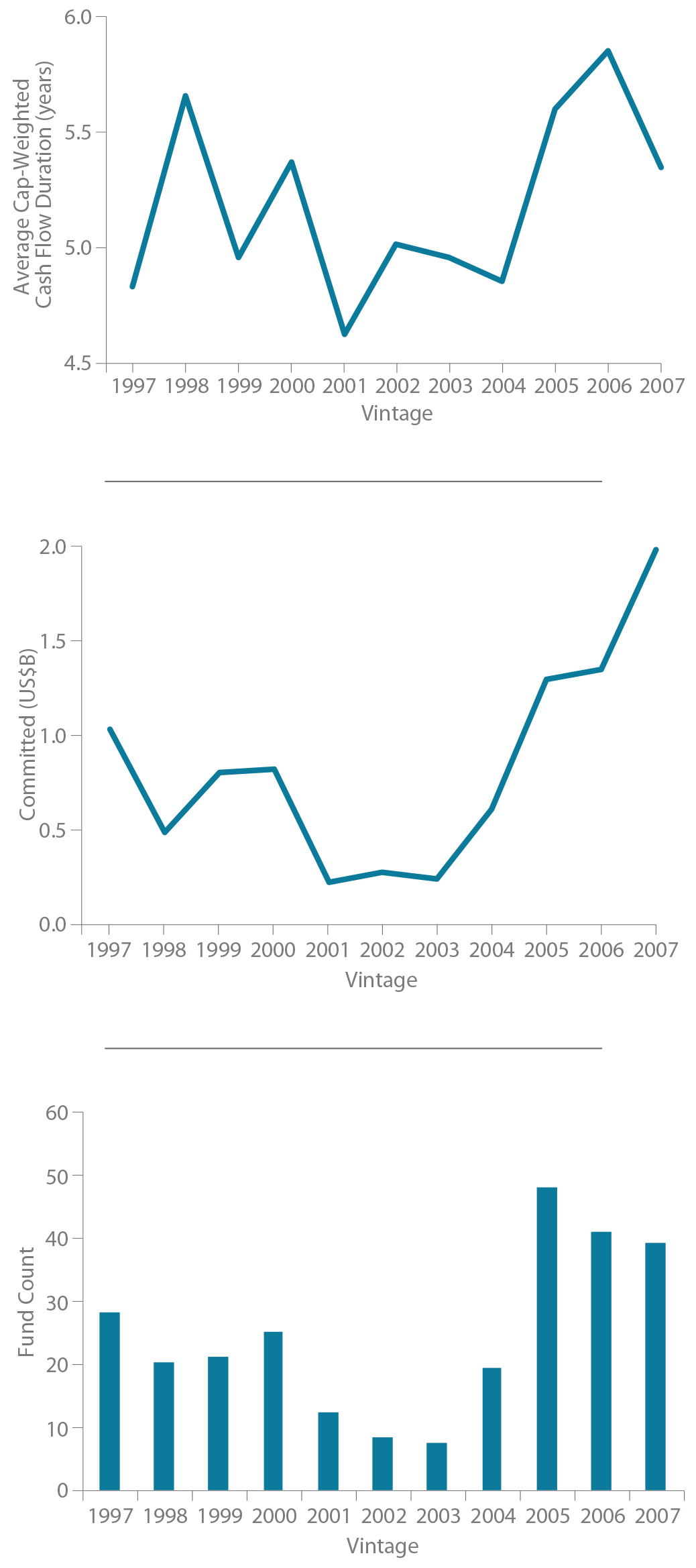 In this case, the average is calculated using only three funds. Interestingly, the one with the greatest amount of invested capital happens to have the longest duration. For subsequent fund analyses, we focus on vintages 1997–2007.