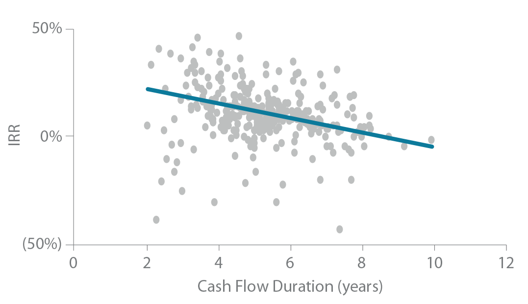 The plots in Figure 9 help explain the through-the-cycle duration of 5.1–5.3 years. While the funds came from all performance quartiles, some vintages had no top-quartile representatives. Therefore, we expect our estimates of 5.1–5.3 years to be a bit higher than a subset with more top-quartile funds. Splitting funds by quartile, we find the median cash flow durations come out to 4.5 years (1st quartile); 5.3 years (2nd quartile); 5.4 years (3rd quartile); and 5.1 years (4th quartile).