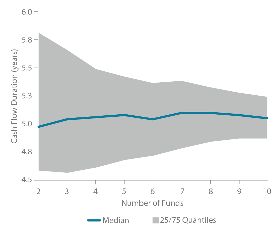 In the portfolio context, there will be more than one fund investment per vintage year. To assess how this affects duration, we looked at different combinations of buyout funds that drew capital beginning in 2004. Assuming equal investments in up to 10 funds, we computed the distribution of cash flow duration. The median duration for each of these portfolios, as well as the 25th and 75th quantiles, is presented in Figure 11.