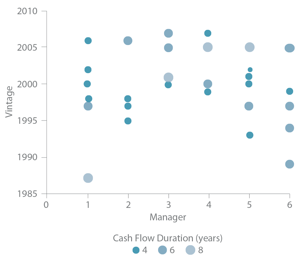 Using the buyout fund data, we show fund durations over time for a sample of six randomly selected managers (Figure 12). The y-axis shows the vintage year of the fund, and the size and color of the bubble indicate the cash flow duration. Manager 1, for example, suffered during the stress periods of the late ’80s as well as 1997, but has had consistent, reasonable fund durations since. In its 2006 fund, it managed to keep duration low even while many of its peers could not. Managers 2 and 3 show very consistent fund durations over time, though Manager 3 leans toward longer durations. Managers 4 and 5 have a variety of durations for their funds and show cyclical behavior. In this pool of managers, the manager with the most underlying assets (Manager 3) had the most consistent duration. For funds that invest in more portfolio companies, staffing and other operational constraints may make it difficult to be overly concentrated in one or two years. GPs with a larger population of deals should have durations closer to the mean, similar to the effect we observed in Figure 11. Moreover, a fund with more assets may attract investors who value diversification more than market timing.