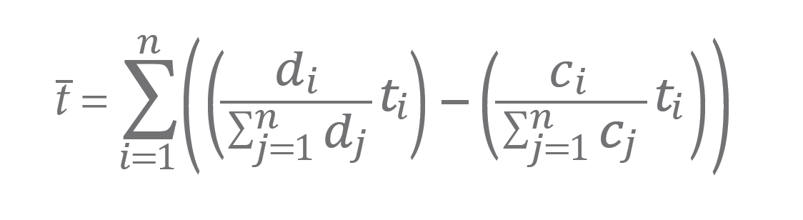 In general, given contributions c1, c2, … , cn (positive or zero) and distributions d1, d2, … , dn (positive or zero) at times t1, t2, … , tn (in years), the cash flow duration is