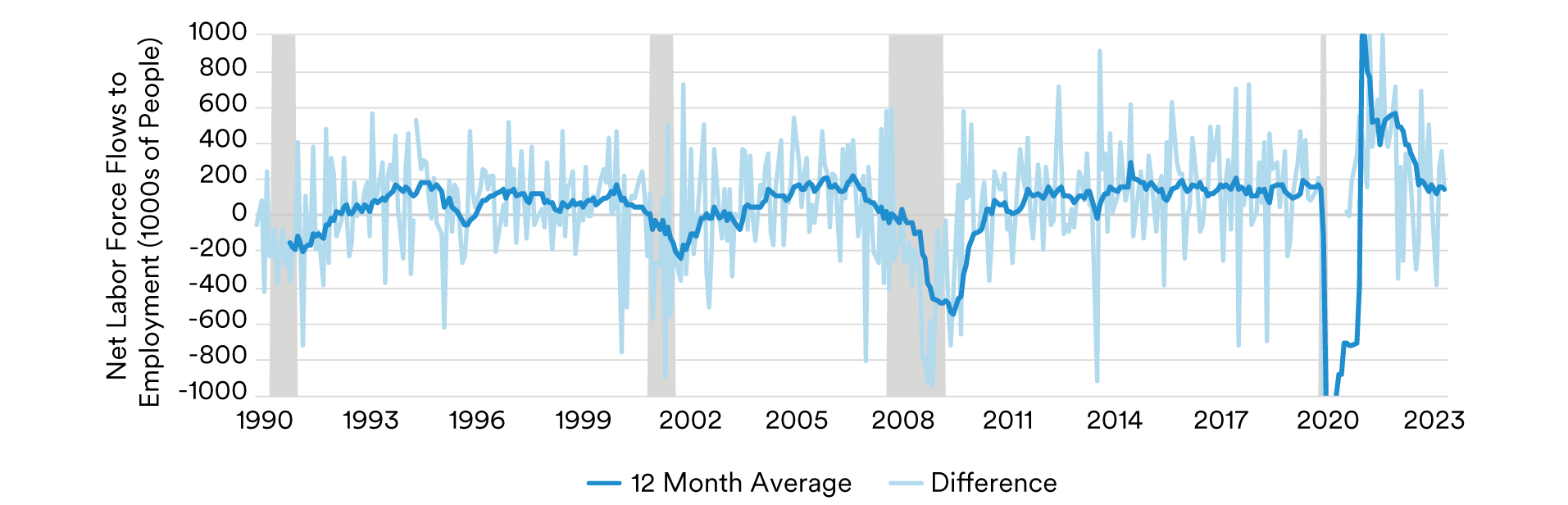 Despite the healthy establishment payrolls increase of 336,000 in September, we see a softening, rather than a signal for the Fed to hike. First, the marginal number of people transitioning into or out of employment has reached pre-pandemic levels (Figure 1). These inflows have slowed over the last two years. The rate of people moving into employment is still healthy in absolute terms, but the metric is may be at a turning point as monetary policy remains tight and corporate profits weaken.