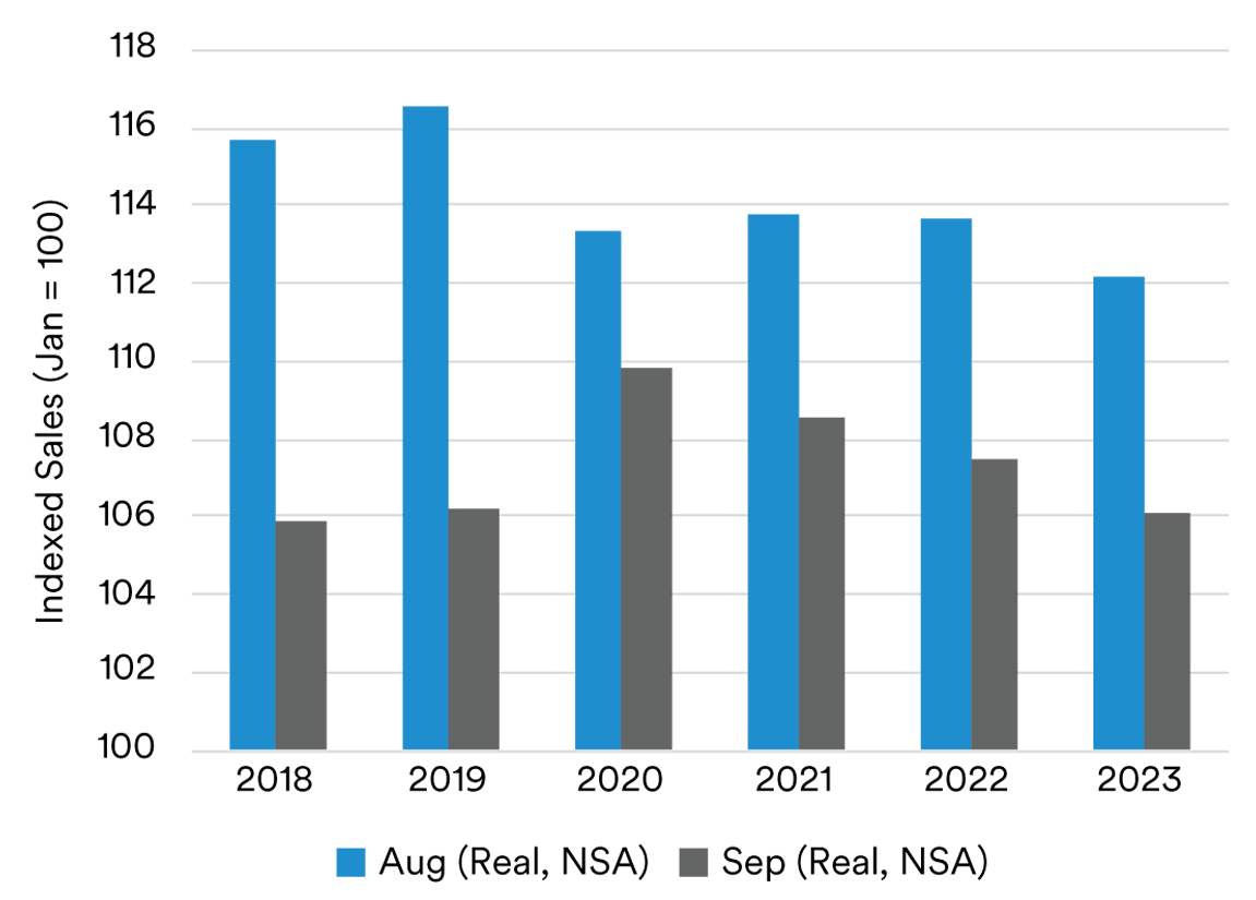 The seemingly positive picture flips when examining real, non-seasonally adjusted retail sales (see Figure 2). The year to date growth for August and September 2023 show a decelerating growth trend since its peak in 2021. The picture overall suggested that the U.S. consumer is not quite as strong as thought. Looking forward, future retail sales reports may continue to show signs of weakening as consumers face high credit card balances, higher-for-longer interest rates, and tightening lending standards.