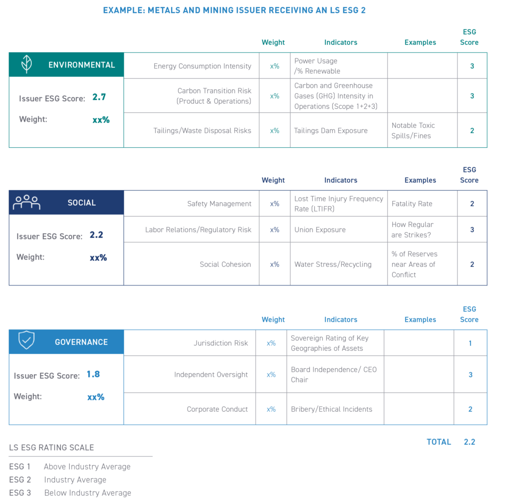 There is a common misconception that investing in issues with high ESG scores involves sacrificing alpha. We would argue that while some sectors or companies screened out by ESG indicators may seem to offer relative upside, they may also carry higher long-term risk from ESG factors (e.g., litigation risks related to environmental harm, labor retention issues or impact of irresponsible suppliers). To assess the most likely outcome, our credit research analysts carefully construct “materiality maps” for their coverage sectors. These tools focus on the ESG factors and sub-factors with the greatest potential to impact an industry, including adjusted weightings for specific ESG factors to reflect their relative importance. In the end, our credit research analysts evaluate each issuer they follow against its industry materiality map and assign a Loomis Sayles ESG score of 1 (above industry average) to 3 (below industry average), as shown in the sample map below. Using Loomis Sayles’ proprietary relative value tools, we can analyze alpha opportunities through an ESG lens. We are also able to filter preferred names that, in our assessment, add an absolute and relative ESG advantage.