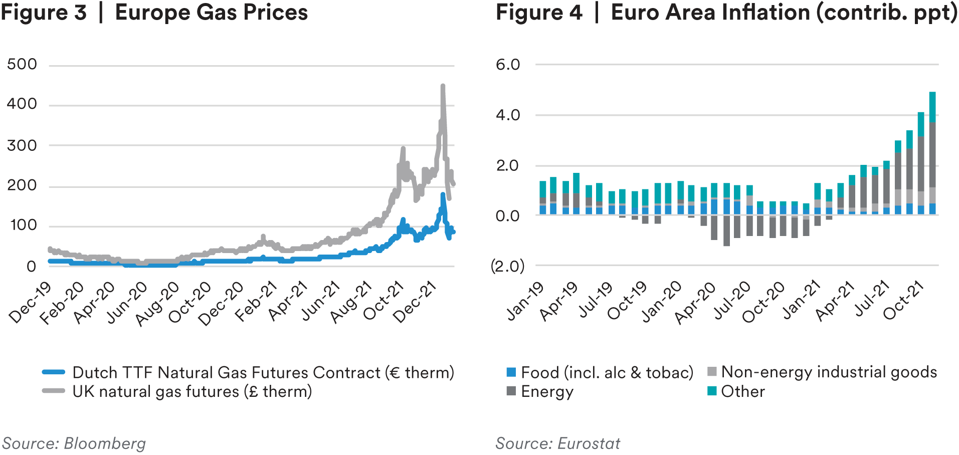 In the UK, inflation is expected to linger for longer and remain above the Bank of England’s (BoE’s) 2% target through 2022. While the recent fall of LNG prices provides some relief, they remain materially higher coming into 2022. The UK’s low storage capacity and subsequent vulnerability to spot LNG import prices leaves its inflation profile relatively more exposed to volatile global prices. Following Brexit in 2021, the UK faces risks related to underlying upward cost pressures from higher non-tariff costs of trade, as well as a less flexible and now tight labor market (including sharply lower net immigration). This differing risk profile helps to explain the divergent 2022 policy outlooks for the ECB, which is not expected to raise its main refinancing policy interest rate from zero before 2023, and the BoE, which began to raise rates in December and is expected to continue to do so through this year.
