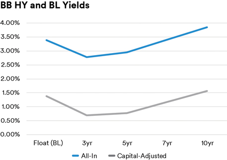 Relative value. In addition to asset sector fundamentals and the macroeconomic outlook, relative value is important input in the strategic and tactical asset allocation process for insurance companies. While absolute spreads and yields are factored in, we believe insurers should evaluate investments on a risk or capital-adjusted basis to determine the relative attractiveness of asset classes. Risk-adjusted yields allow for comparability by asset class by incorporating differences in capital treatment and loss experience, as well as additional spread premiums on private assets. In the current environment, according to MetLife Investment Management, 10-year BB-rated bonds are yielding approximately 3.8% or roughly 1.6% on capital-adjusted basis after deducting default shaves (largely based on Moody’s historical experience) and U.S. RBC risk charges for life insurers (after-tax based on a 400% target RBC ratio less a return on required capital). As shown below, HY and BL capital-adjusted yields can be compared to other public fixed income and private assets to help determine whether investors are being adequately compensated for the risk inherent in these asset classes. While on average private assets may offer more attractive capital-adjusted returns, insurance companies can identify the breakeven yield where they may be indifferent between a new investment in a HY bond / BL or a private asset. For example, at present, according to analysis by MetLife Investment Management, a 10-year BB-rated HY bond yielding approximately 4.8% would provide a capital-adjusted yield roughly equivalent to that of a private asset composite (consisting of 10-year private corporates, commercial mortgage and agricultural loans and private structured debt). While this capital-adjusted yield framework provides a quantitative lens to compare asset classes, we believe insurers should also apply a qualitative overlay to the relative value process. One factor to consider is where we are in the credit cycle and the expectations for future ratings downgrades / defaults, as well as the potential for downside protection that private assets have historically provided in times of stress (for example, in the form of financial covenants). Another factor to consider going forward is the potential changes in NAIC capital factors, which could occur in 2021 or later and may potentially impact the attractiveness of the HY asset class. Additionally, the potential for higher interest rates in the future may make bank loans more attractive due to their floating rate nature, particularly for insurers that have floating rate liabilities.