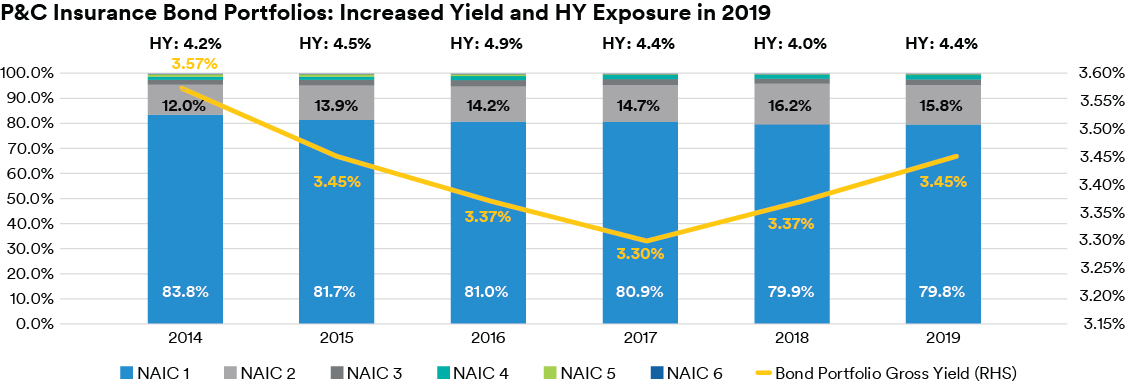 Bond quality for the P&C industry varies from the life industry, most notably with higher exposure to NAIC 1 and lower exposure to NAIC 2 holdings. Additionally, with generally shorter-tail liabilities and lower investment capital charges as compared to life insurers, the variation in high yield allocations has not been as dramatic for P&C insurers; in fact, the industry’s exposure to high yield increased in 2019 to 4.4% of total bonds at December 31, 2019 from 4.0% at December 31, 2018. The mix of P&C insurers’ exposure to high yield is relatively balanced between NAIC 3 and NAIC 4 holdings, as shown in the figure below.