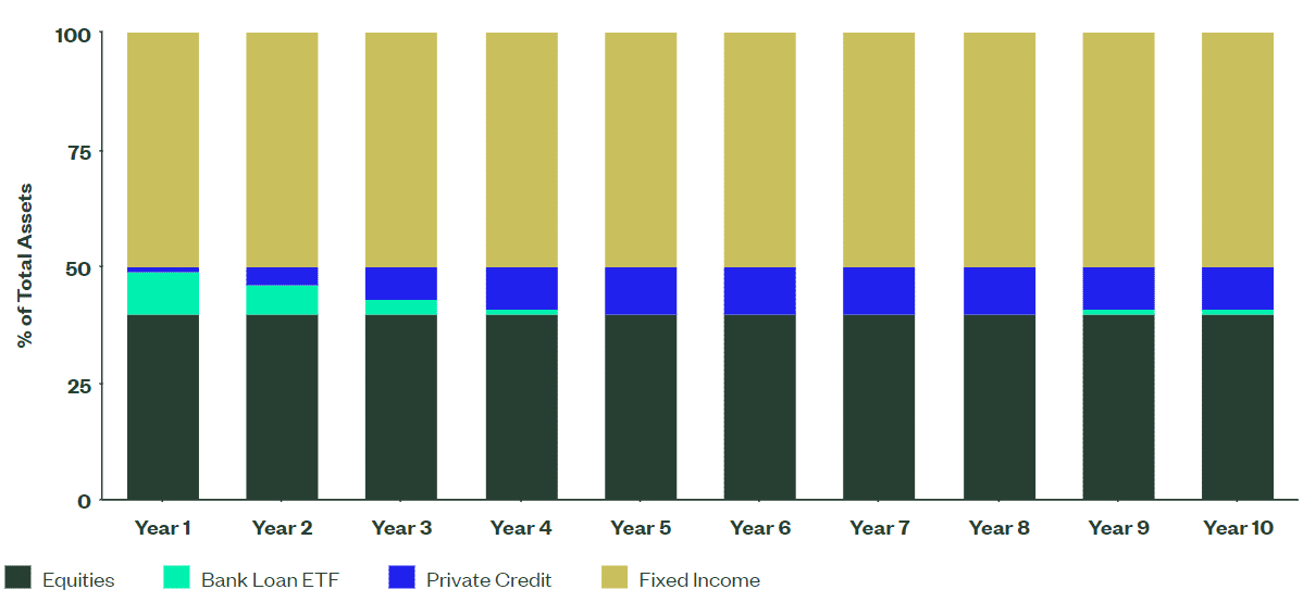 In this example, the Bank Loan allocation is 0% in Year 5, but starts increasing in Years 9 and 10. It is impossible to maintain an exact 10% allocation as private credit investments are illiquid, capital is called when opportunities present themselves, and the allocation in percentage terms depends on how the value of the liquid assets change over time.