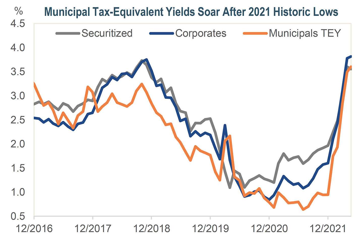 Sources: S&P SNL Financial as of 12/31/21 and Bloomberg as of 5/23/22. Chart on lower left: Securitized shows the Bloomberg US Securitized Index, Corporates show the Bloomberg Intermediate Corporate A or Better Index, and the Municipals Tax Equivalent Yield (TEY) shows the Bloomberg Municipal 1-10 Year Blend (1-12) Index taxable equivalent yields at the historical corporate tax rates (21% from 2018 – present, 35% before 2018). The views contained in this report are those of Income Research & Management (“IR+M”) and are based on information obtained by IR+M from sources that are believed to be reliable but IR+M makes no guarantee as to the accuracy or completeness of the underlying third-party data used to form IR+M’s views and opinions. This report is for informational purposes only and is not intended to provide specific advice, recommendations, or projected returns for any particular IR+M product. Copyright © 2022, S&P Global Market Intelligence. Reproduction of any information, data or material, including ratings (“Content”) in any form is prohibited except with the prior written permission of the relevant party. Such party, its affiliates and suppliers (“Content Providers”) do not guarantee the accuracy, adequacy, completeness, timeliness or availability of any Content and are not responsible for any errors or omissions (negligent or otherwise), regardless of the cause, or for the results obtained from the use of such Content. In no event shall Content Providers be liable for any damages, costs, expenses, legal fees, or losses (including lost income or lost profit and opportunity costs) in connection with any use of the Content. A reference to a particular investment or security, a rating or any observation concerning an investment that is part of the Content is not a recommendation to buy, sell or hold such investment or security, does not address the suitability of an investment or security and should not be relied on as investment advice. Credit ratings are statements of opinions and are not statements of fact.