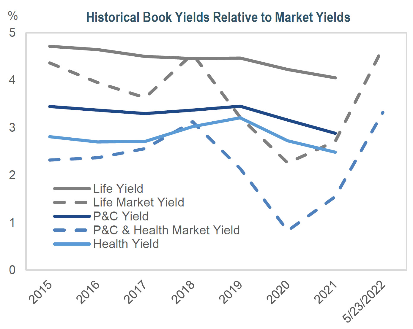 Sources: S&P SNL Financial as of 12/31/21. Lower right chart market yields sourced from Bloomberg as of 5/23/22. P&C and Health market yields are the Bloomberg Intermediate Aggregate Index, Life market yield is 50% Bloomberg Corporate Index/50% Bloomberg Long Corporate Index. The views contained in this report are those of Income Research & Management (“IR+M”) and are based on information obtained by IR+M from sources that are believed to be reliable but IR+M makes no guarantee as to the accuracy or completeness of the underlying third-party data used to form IR+M’s views and opinions. This report is for informational purposes only and is not intended to provide specific advice, recommendations, or projected returns for any particular IR+M product.