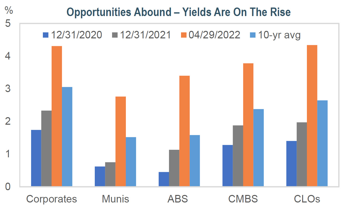 - Higher yields and wider spreads create divergence and opportunities across corporates, munis, and the securitized sector. Year-to-date, yields have risen almost 2% across sectors and are well-above both the trailing 5- and 10-year averages.