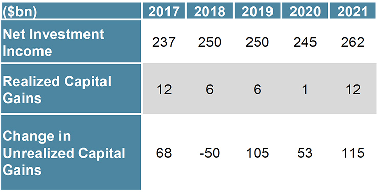 - Despite the continued low interest rate environment in 2021, net investment income and unrealized capital gains also reached record highs of $262 and $115 billion, respectively, aided by the higher equity allocation within Property & Casualty (P&C) companies.