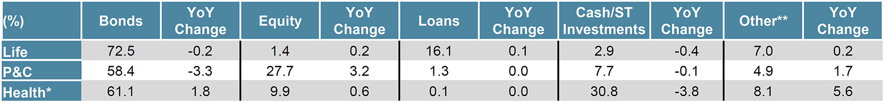 - Overall asset allocation shifts were small and on the margin. P&C ended the year at another all-time high for equity allocations, likely driven by strong equity market returns in 2021, while bonds reached their third consecutive low.