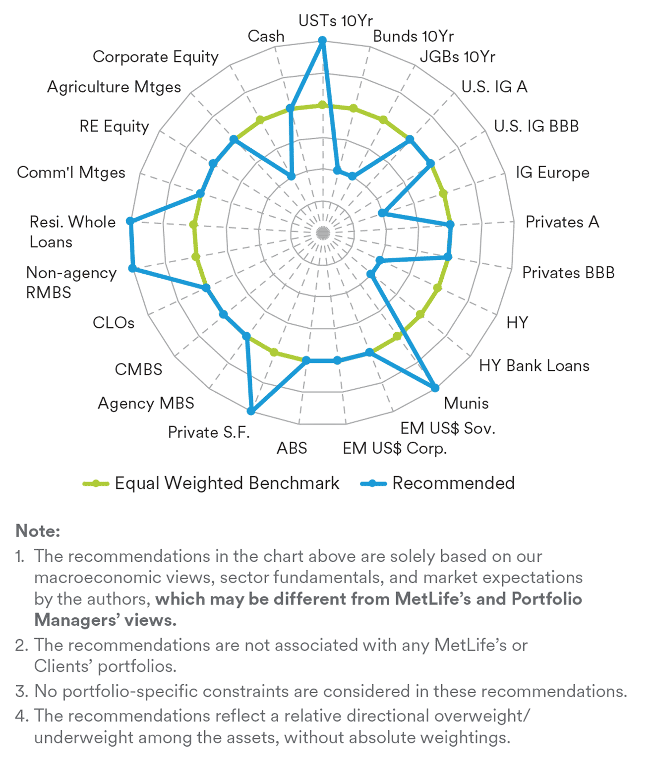 - Long-duration and safe-haven assets, e.g., Treasuries and munis, are preferred, considering our view on recession risk and the potential for lower yields.