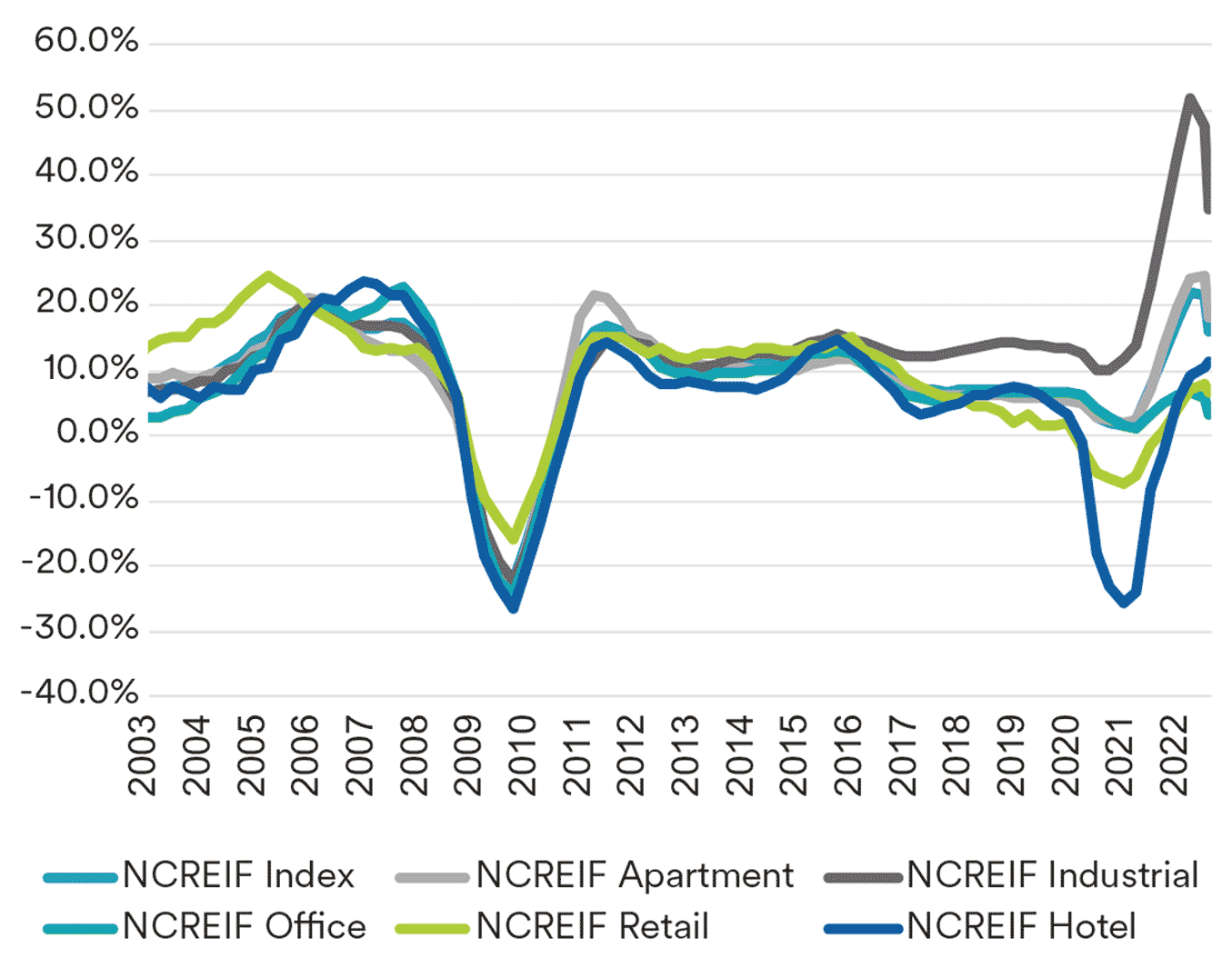 Real estate fundamentals remain mostly healthy. Inflation has run above expectations, which has generally benefited property income growth, and vacancy rates remain near historical lows for most property types. Still, looming economic headwinds have tempered growth expectations. The outlook for the economy and commercial real estate performance has softened somewhat. Recent transactions and offerings suggest real estate equity pricing has improved, with discount rates up around 75 basis points, but not sufficient to match the move in Treasury rates. Transaction activity for both real estate debt and equity has slowed.