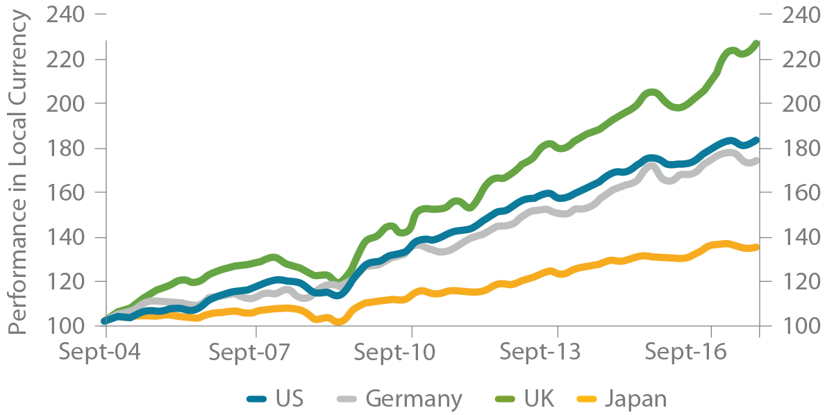 Historically, the lack of exposure to alternative risk premia was easy to justify. The yield compression in fixed-income securities over the past 37 years created capital gains for insurance companies that obviated the need for non-traditional yield enhancements. In the US, Treasury yields have fallen by nearly 1,200 basis points since 1981. Over the same period US corporate bonds have generated gross annual returns of approximately 8.6%. Other developed markets look similar: since 1989 the 10-year Bund yield has fallen more than 700 basis points to -0.3%, and 30-year Japanese bonds are yielding below 1%.