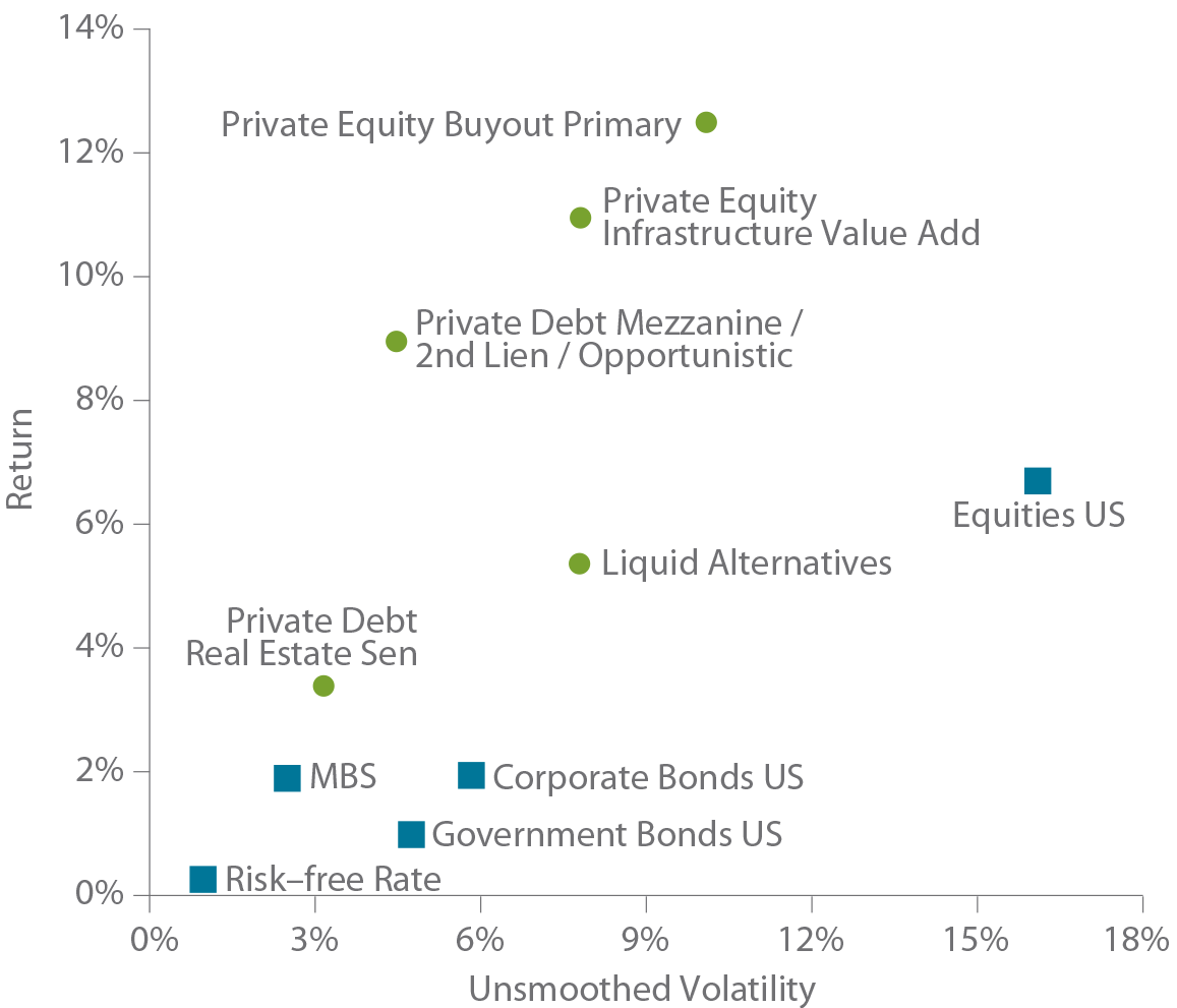 9 In this example, we replaced 7.0% of positions in Government Bonds, 6.5% of positions in Investment-grade Bonds, 3.5% in Other Credit and 3.0% of positions in High-yield Bonds with a 14.0% allocation to Corporate Direct Lending, 3.0% to Infrastructure Private Debt, and 3.0% to Real Estate Private Debt.