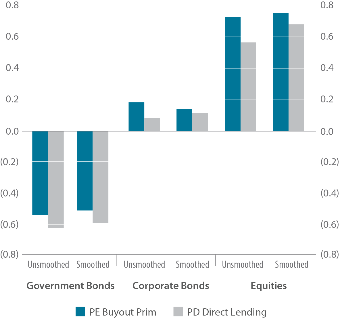 Not only are return expectations higher for private markets than their public counterparts, but the fact that some asset classes are uncorrelated with traditional investments can diversify systemic risk, generating a higher expected return for any given level of volatility. These diversification benefits are partly the result of a phenomenon known as smoothing.11 As seen in Figure 9, smoothing has very little impact on the correlation between public and private market volatility. For example, leveraged buyouts and direct lending strategies are negatively correlated to government bonds, have a low correlation to corporate bonds, and a limited, albeit higher, positive correlation to equities.