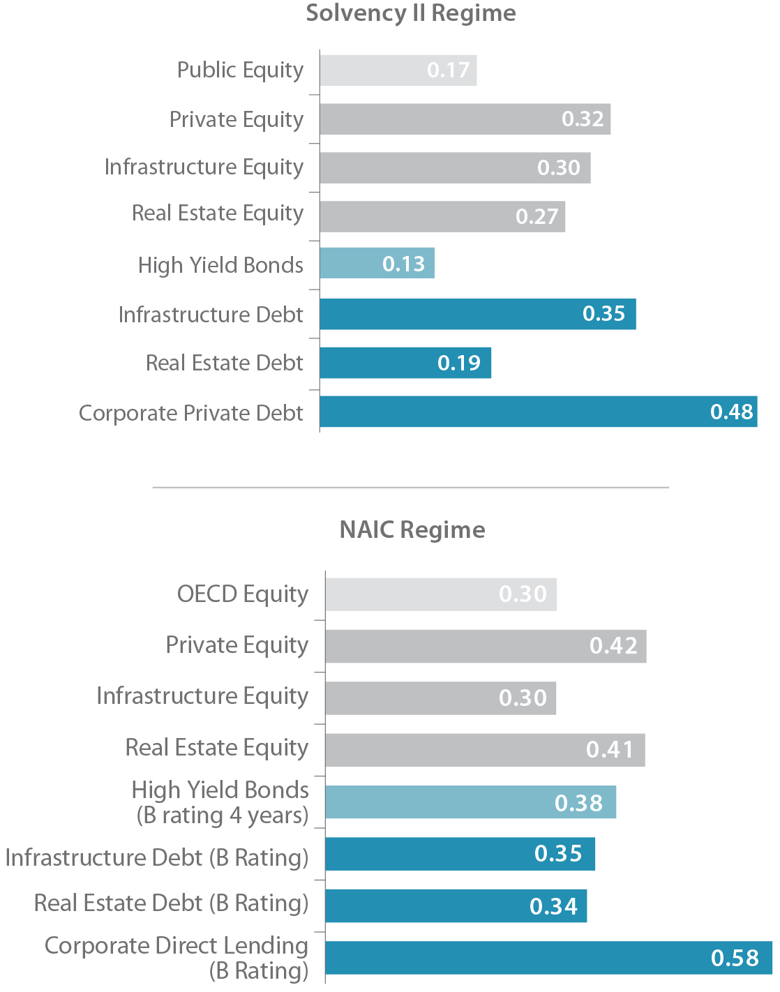 Even when done in isolation, comparing an investment’s solvency capital to its expected return can be a valuable exercise and helps to further illustrate why insurance companies are increasing their allocations to private markets. As a result, one can judge how much solvency capital is required for an investment with a certain risk-adjusted return expectation. For example, a ratio of 0.5 would indicate an expected risk-adjusted return of half of the solvency capital to be reserved. The higher the ratio, the more effective the investment. This information is especially valuable when determining an insurer’s SAA. Figure 10 illustrates the average capital efficiency for several types of investments under the Solvency II (top) and NAIC (bottom) regimes. In most cases, private markets generate higher returns for each unit of solvency capital.