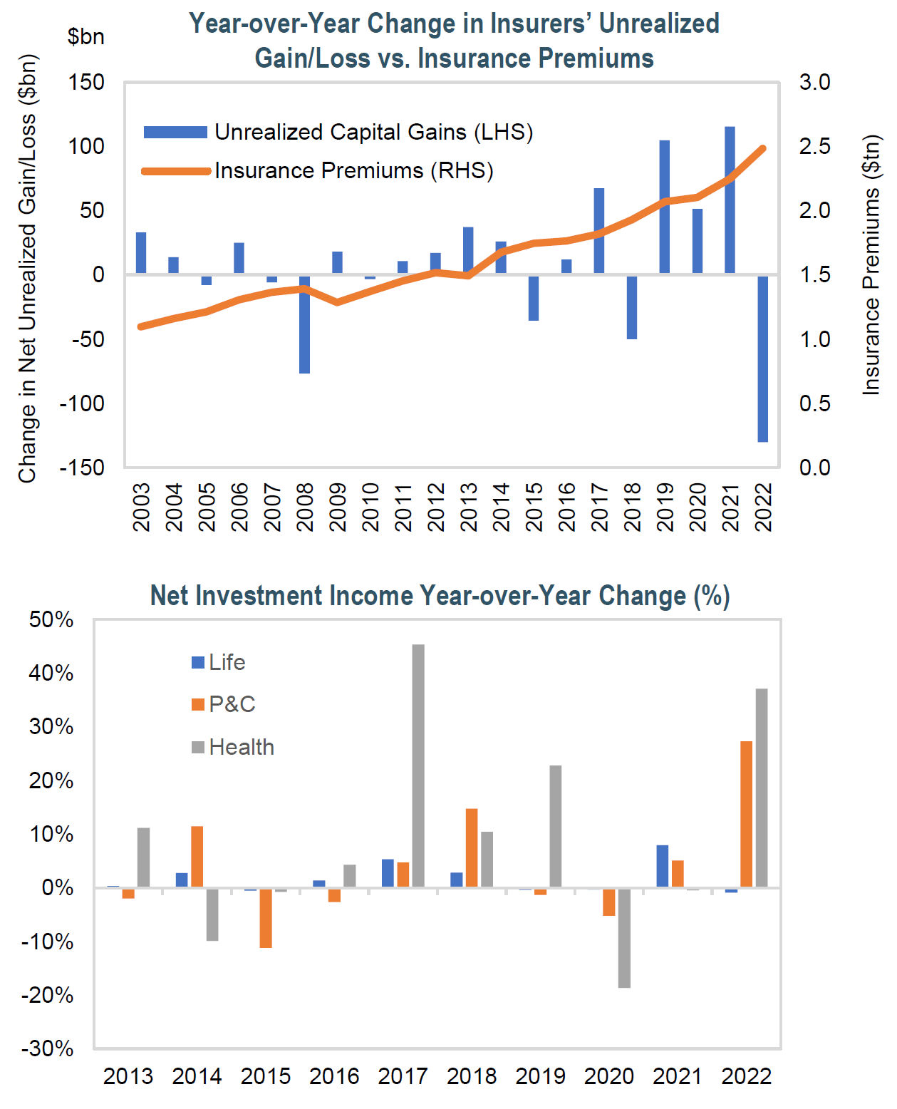- Given the sharp rise in interest rates and lower equity prices, insurers are now faced with an additional $130 billion in unrealized losses. As a result, insurers may experience potentially meaningful consequences should they implement changes to asset allocations.