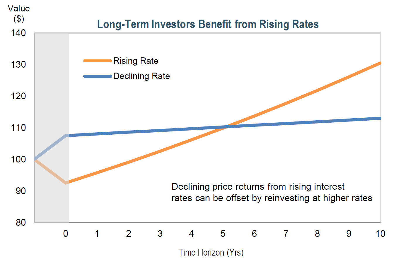 Sources: S&P SNL Financial as of 12/31/22, but retrieved on 5/18/23 and Bloomberg as of 5/18/23. Long-Term Investors Benefit from Rising Rates Chart: Shown for illustrative purposes only. Actual results may differ.