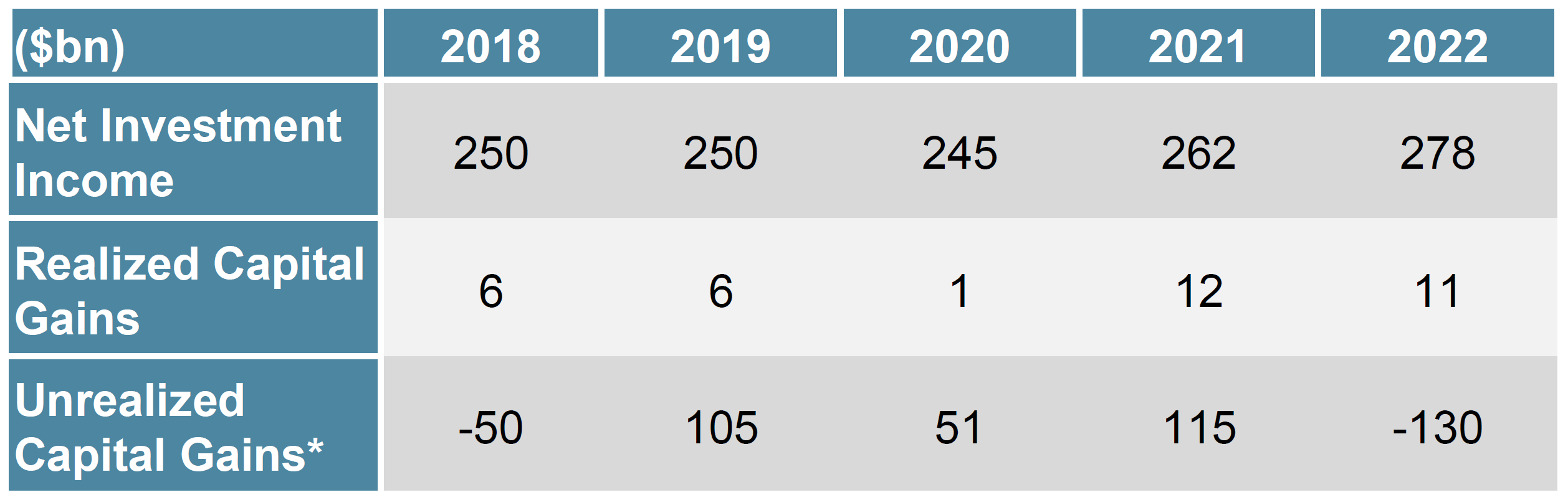 Sources: All data, charts, and tables sourced from S&P SNL Financial as of 12/31/22, but retrieved on 5/18/23. Top table shows the aggregated amount for Life, P&C, and Health insurers.