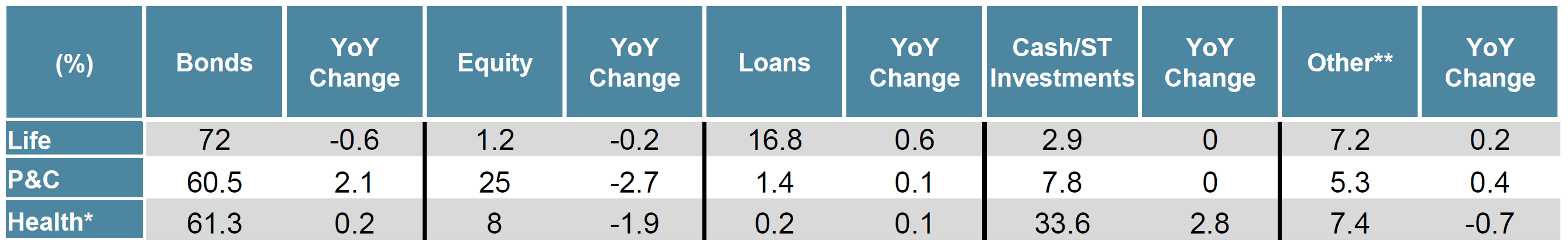 - Most insurers were likely limited by the large unrealized losses in their portfolios and overall asset allocation shifts were small and on the margin. For the first time since 2018, P&C companies’ fixed income allocations increased, and equity allocations decreased. This was likely driven by weak equity performance in 2022 and fixed income assets being carried at book value.