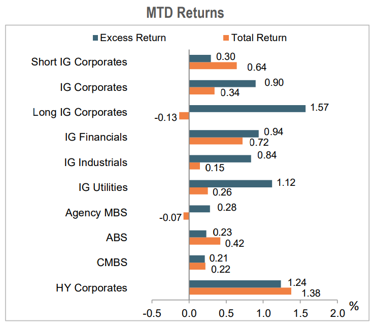 - Securitized products broadly outperformed Treasuries, but underperformed corporates on the month; agency mortgagebacked securities (MBS) outperformed other securitized products driven by the positive economic and inflation data