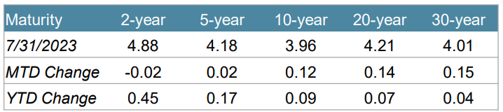 - Treasury rates rose slightly on the month, apart from the 1-3-year portion of the curve; the 10-year Treasury yield rose by 12bps from 3.84% to 3.96%
