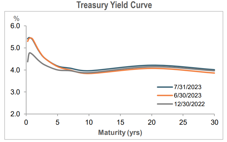 - The FOMC resumed its hiking campaign in July, increasing the federal funds rate target range by 25bps to 5.25% - 5.50%; Chair Powell did not rule out further rate increases while markets expect little change to the current rate through year-end