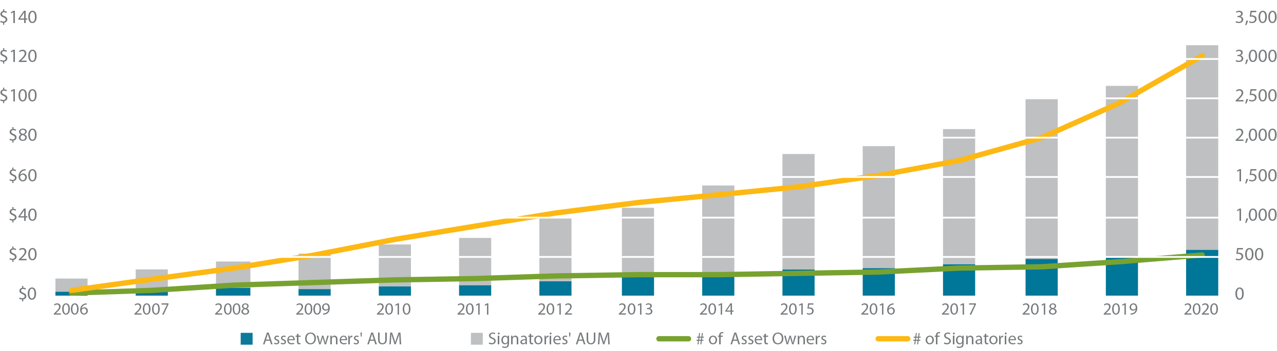 Over the last decade, investors of all types have taken to thinking more critically about their fiduciary responsibility and their ability to help solve environmental, social and governance (ESG) challenges. The rapid growth in the number of signatories to the Principles for Responsible Investment (PRI) is a testament to this evolution. Since its founding in 2006, more than 3,000 organizations representing over $100 trillion in assets under management (AUM) have adopted the PRI. More than 500 signatories are asset owners (Figure 1).