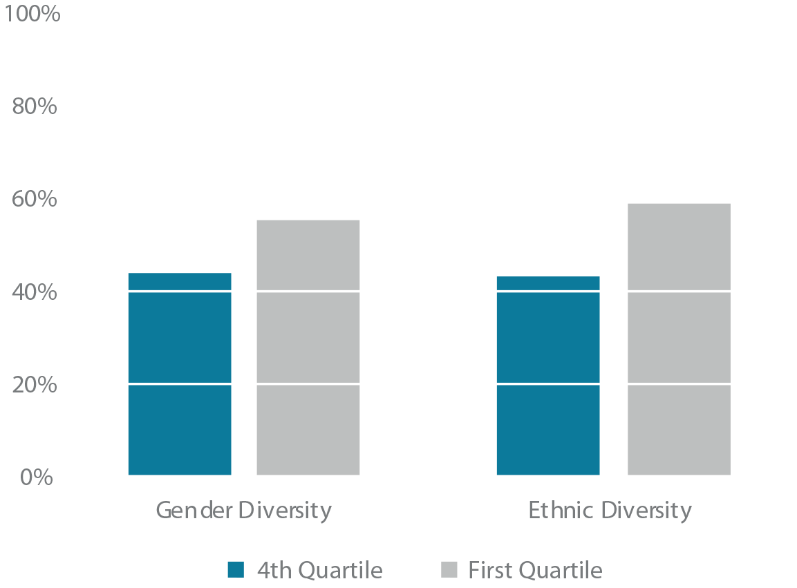 There is a growing body of evidence that expanding one’s investment calculus to include ESG considerations can be a source of alpha. In both public and private markets, data corroborate the strong performance of diverse investment and management teams. On the public side, a 2020 McKinsey study found that diverse teams outperform their more homogeneous peers.6 As seen in Figure 2, companies with executive teams in the first quartile of gender or ethnic diversity are more likely to generate above-average profits than their less diverse peers. A more recent study by Goldman Sachs that looked at 496 largecap US equity funds found that those with at least one-third of manager positions held by women outperformed those with no women by one percentage point in 2020.7