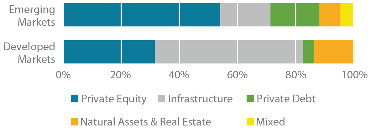 Our proprietary private market research library, SPI, tracks over 700 private impact investment funds and more than 400 managers. Owing to this breadth of coverage, we have observed similar trends. Developed market funds make up 85% of our mapped universe (by number), with the greatest focus on private equity and infrastructure.13 The funds are split roughly equally between those that focus on environmental outcomes and those that focus on social outcomes, including multi-theme funds that target both. We have found that clients can access many themes by investing across asset classes. For example, we have found compelling climate investment opportunities among our private equity, infrastructure and real estate managers.