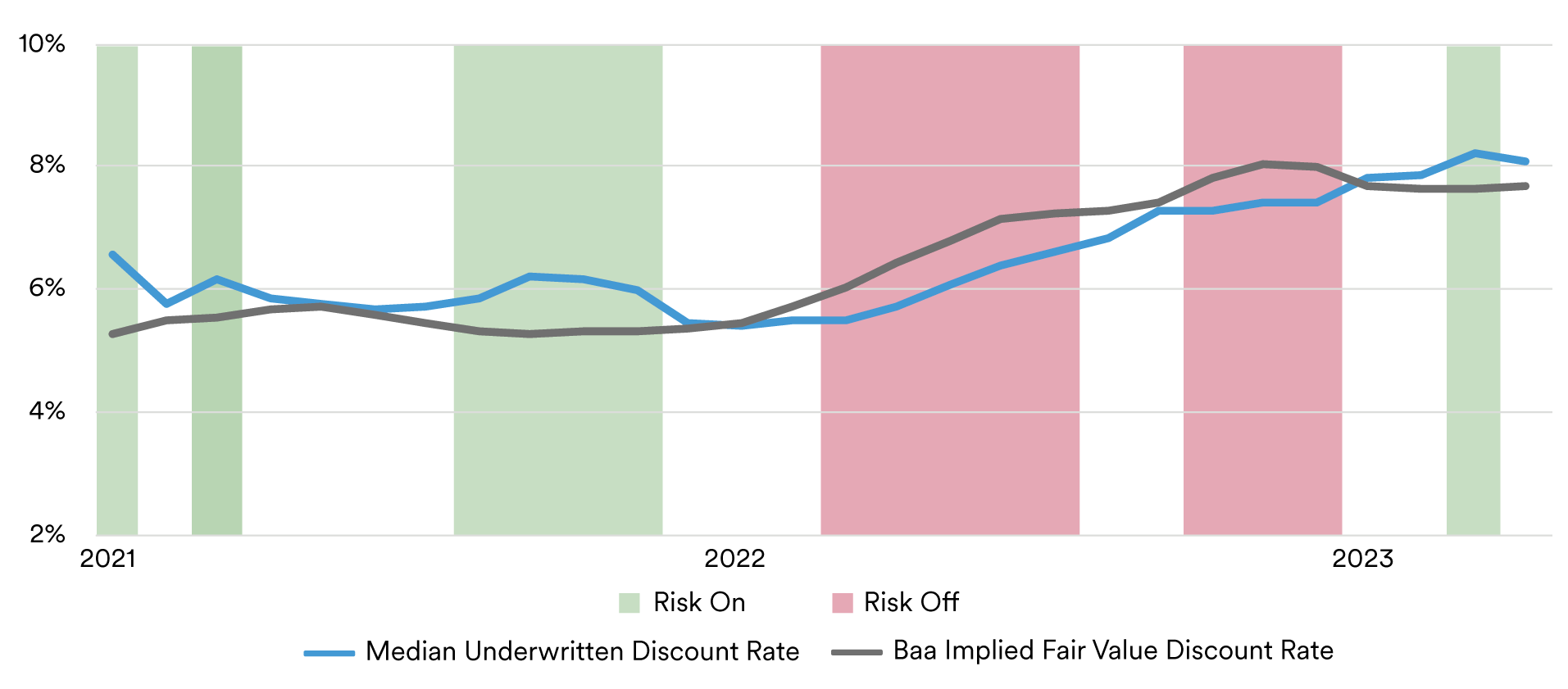 Source: MIM, RCA. May 2023 As we indicated in our September 2022 real estate outlook report,iii discount rates for core,iv unlevered commercial real estate, a key input in determining property values, have been approximately equal to Baa corporate bonds plus 200 basis points (bps) over time. We, therefore, generally consider this level to be an approximate barometer for neutral relative value and view periods of time when discount rates rise above Baa +200 bps worth considering increasing risk in new real estate investments (risk on approach), and periods below that threshold, worth considering decreasing risk (risk off approach). As of this writing, this analysis suggests that real estate is now being offered at a fair to modestly attractive relative value (see exhibit 2).