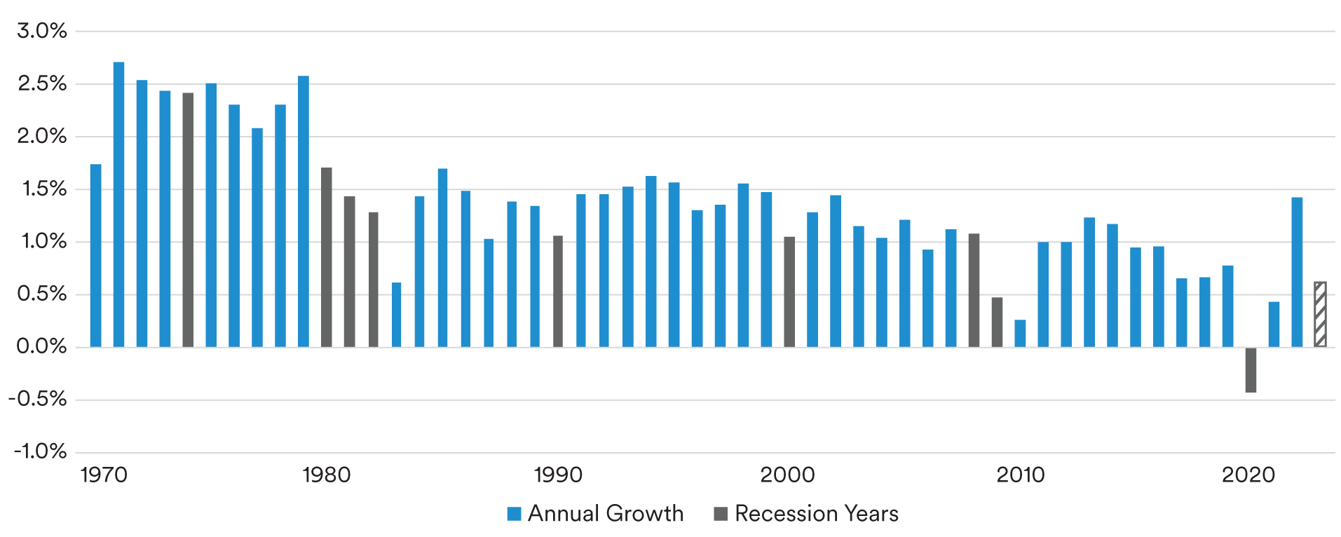 - We expect a modest recession in 2023, with full-year GDP growth of 0.9%.
