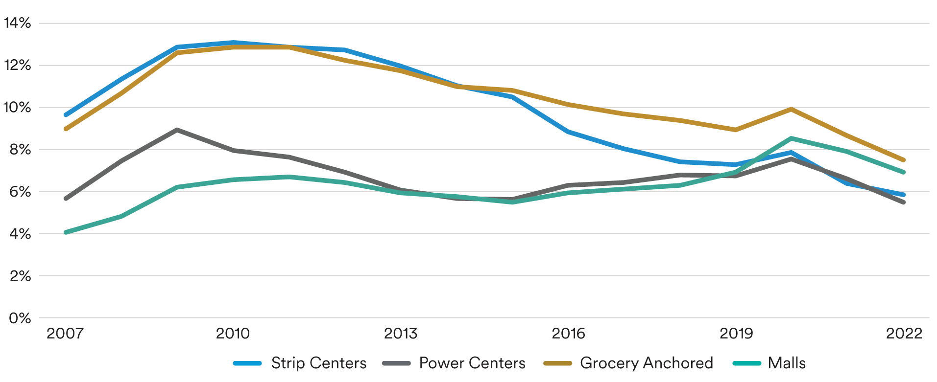 As we have noted in recent quarters, the retail sector has been one of the most notable upside surprises coming out of COVID-19. Due in part to low construction activity, the average retail vacancy rate is at a historical low. Even the challenged mall subsector is beginning to see vacancies decline, though this is largely due to negative supply growth with lower-quality assets being shuttered.