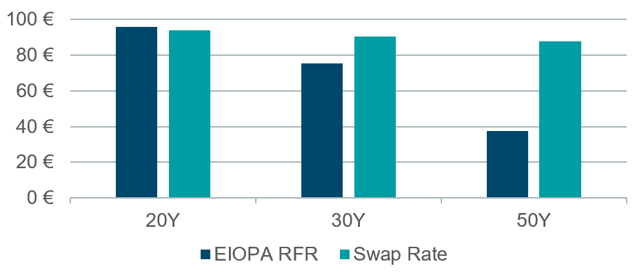Figure 1. Illustrative Example of DISCOUNTING EUR 100 at the EIOPA RFR vs. Swap rates