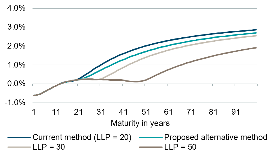 Under the current method, the Euro risk-free rates for maturities before the last liquid point (LLP) of 20 years are directly derived from swap rates. But after the LLP, interest rates are smoothly extrapolated towards a constant ultimate forward rate (UFR). Since swap market information past the LLP is not taken into account in this extrapolation, there can be a significant divergence (in particular, in today’s low interest rate environment) between the extrapolated rates and the actual swap rates. This divergence and the associated concern that the value of liabilities are severely underestimated (see Figure 1) is the basis for supervisory concern and EIOPA’s review.