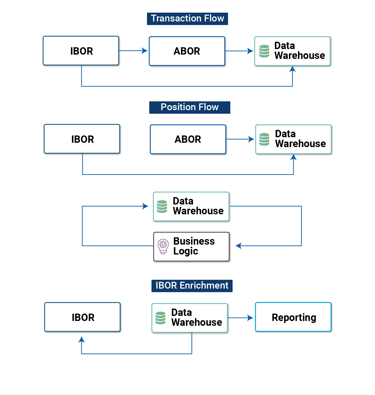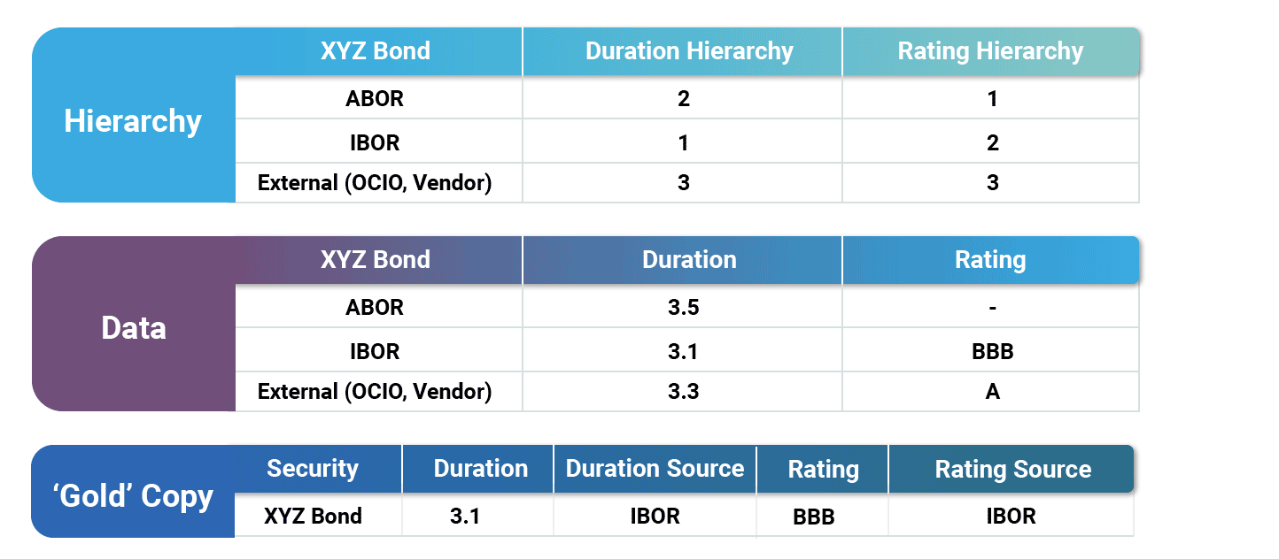 One key capability provided by the centralization of business logic to a holistic data warehouse is that data source hierarchies must be robustly maintained. ABOR and IBOR have broad sets of data unique to each system, but there is considerable overlap between the two as well. Given there are data fields that may exist in both systems, it is imperative to have a mechanism to dictate the preferred source, secondary, tertiary, and subordinate sources for each data element. Records that are cleansed and processed in this manner are typically referred to as “gold copy” data.