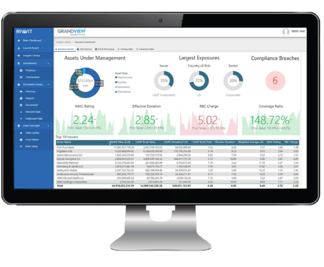 Grandview’s managed data platform, Rivvit, was designed to clean, govern and integrate data from multiple sources. Investment accounting data seamlessly integrates to portfolio management, compliance, risk, and other systems to provide decision makers with a holistic view of their book. Investment personnel can navigate custom dashboards, bringing together NAIC ratings, capital charges, risk exposures, book data, security analytics, compliance, and more.