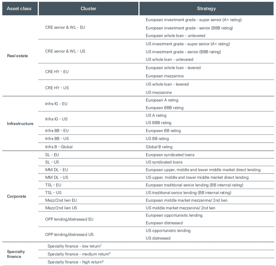 In this study, we take a comprehensive approach to the private credit universe consisting of 13 main strategies, divided into 57 different sub-strategies and covering predominantly the US and Europe. For each sub-strategy, we maintain a set of 25 measures including spreads, loss rates, stress losses, duration, and annual deployment capacities, which are updated regularly. Each strategy offers a different risk-return profile with varying drivers and can thus play a different role in a strategic asset allocation. Using over 50 sub-strategies for assets allocation decisions is complex. To reduce that complexity and focus on core drivers for portfolio construction, we cluster sub-strategies into groups with similar risk-return profiles. This grouping of sub-strategies is done through a qualitative assessment of each strategy, a quantitative assessment of its correlations, and clustering techniques to identify similar risk-return profiles, as depicted in Figure 2.