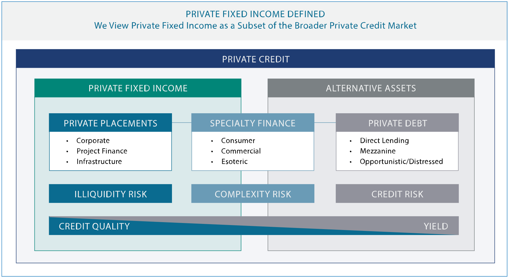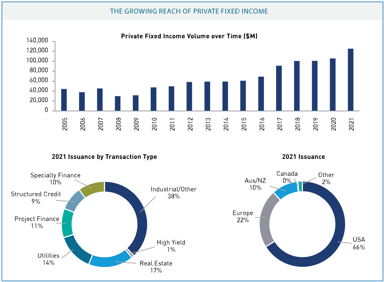 The opportunity set in private fixed income is large and growing as the asset class evolves beyond its roots in the conventional private placement market into new sectors, geographies and structures.