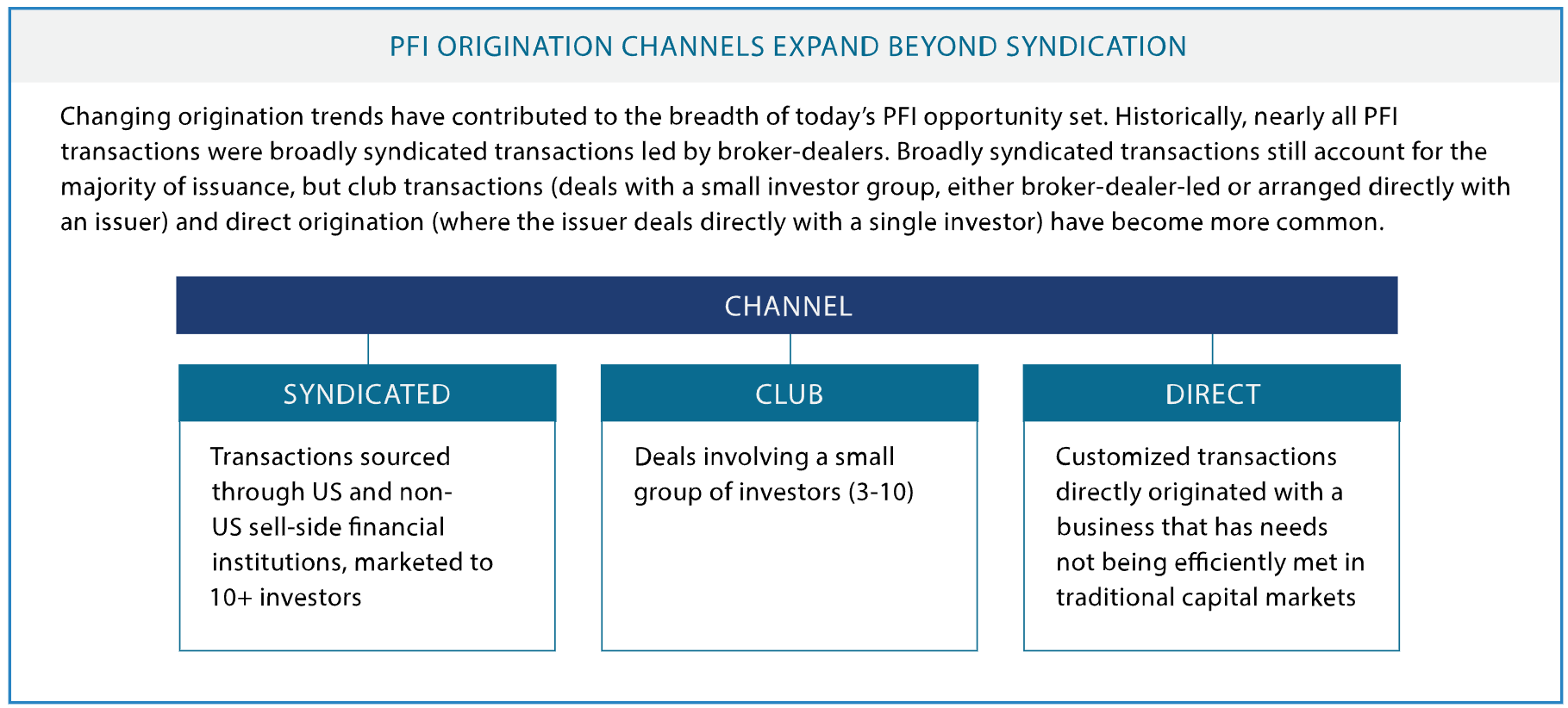 - Strong relationships and a deep origination pipeline. The ability to source distinct opportunities is a differentiator in PFI. A wide network and credibility with both broker-dealers and issuers helps a manager get a first look at new transactions and a stronger position in the origination pipeline. Seeing a large volume of potential transactions can enable a manager to be highly selective, which we feel is essential to building a quality PFI portfolio.